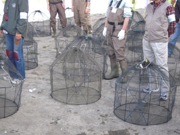 イタセンネットでは、2012年4月から城北ワンド群で外来魚の定期駆除活動を開始しました。特殊な網もんどり(写真)の設置と地曳網による外来魚の一斉捕獲を行っています。城北地区の数か所のワンドでは、在来魚の種類と数も増加傾向にあり、捕獲による、ブルーギルなどの肉食性外来魚の抑制効果が少しずつ表れているようです。今後は毎年、春から秋までの週末に定期外来魚駆除の活動を行っています。皆さまのご協力・ご参加をよろしくお願いします。